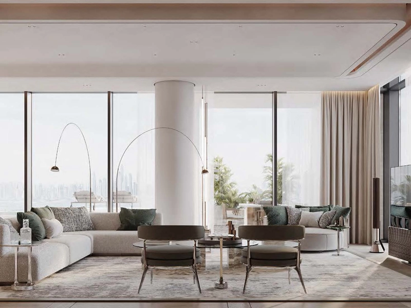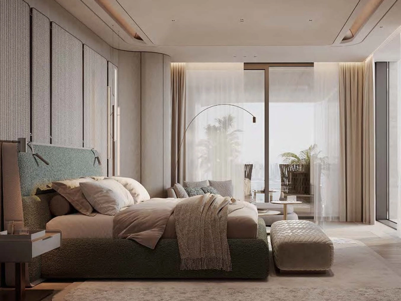 طراحی یکنواخت و دلپذیر طبیعت بین دریا و شن، با پلان باز طبقات، پنجرههای بزرگ از کف تا سقف و بالکنهای منحنی، شما را به تجربه زیبایی آبهای آبی کبالتی منطقه پالم جمیرا دعوت میکند.
